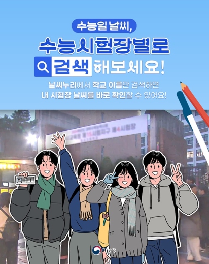 [코리아 이슈저널=최용달 기자] 날씨누리에서 학교 이름만 검색하면 내 시험장 날씨를 바로 확인할 수 있어요!