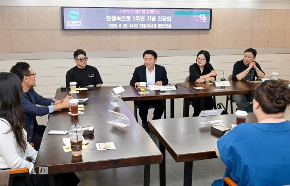 | ▲ 김동근 시장이 6월 25일 ‘민생 속으로’ 1주년을 맞아 간담회를 열고 그동안 현장에서 만난 시민들과 소통하고 있다. |