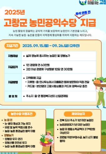 [코리아 이슈저널=김종오 기자] 고창군이 농업인의 생활 안정과 지역경제 활성화를 위해 ‘농민 공익수당’을 추석 명절 전에 지급한다.