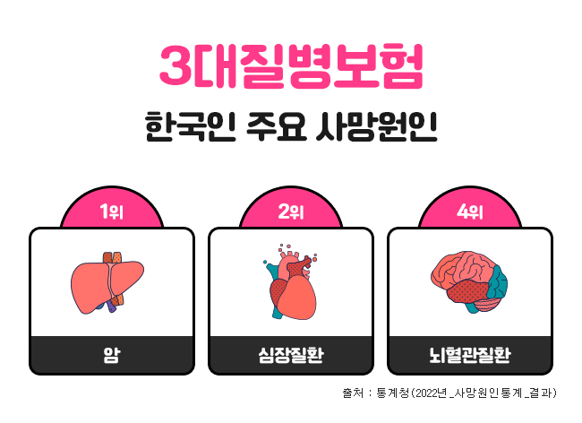 [코리아 이슈저널=최준석 기자] 3대질병으로 일컬어지는 암, 뇌혈관질환, 심혈관질환은 한국인의 주요 사망원인에서 상위를 차지하고 있으며, 이에 대한 진단비를 집중적으로 보장해 주는 보험상품을 3대질병진단비 보험이라 할 수 있다.