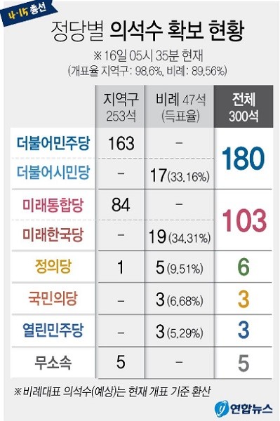 전국 개표율 99.3%를 기록한 16일 오전 6시 22분 더불어민주당과 비례정당 더불어시민당이 단독으로 180석의 의석을 확보하는 것으로 집계됐다. 미래통합당과 미래한국당은 개헌저지선인 100석보다 3석 많은 103석으로 보고 있다.
