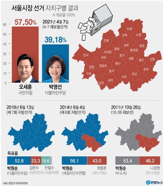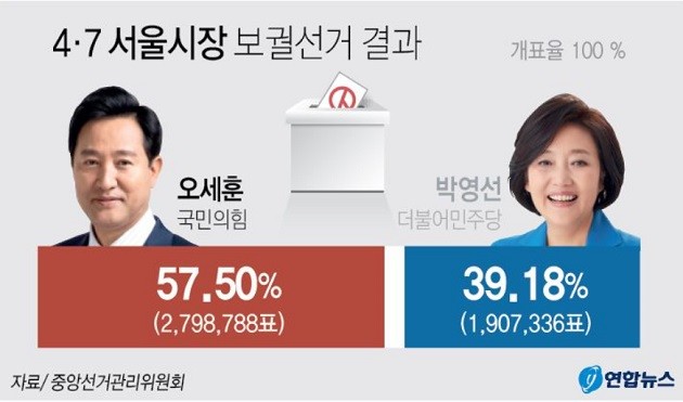 8일 중앙선관위에 따르면 서울시장 보궐선거 개표가 100% 완료된 가운데 국민의힘 오세훈 후보가 57.50%를 득표하며 더불어민주당 박영선 후보(39.18%)를 18.32%포인트 격차로 압도했다.