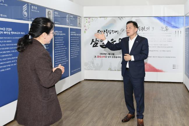 | ▲ 이재준 수원시장이 수원시가 발굴한 13인의 독립운동가 전시를 관람하고 있다. |