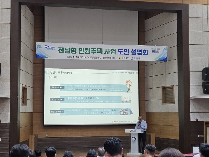 [코리아 이슈저널=김종오 기자] 강진군이 지난 15일 강진군 농업기술센터 대강당에서 열린 '전남형 만원주택 도민설명회'를 100여 명의 군민과 유관기관 관계자, 입주 희망자들이 참석한 가운데 성황리에 마쳤다.