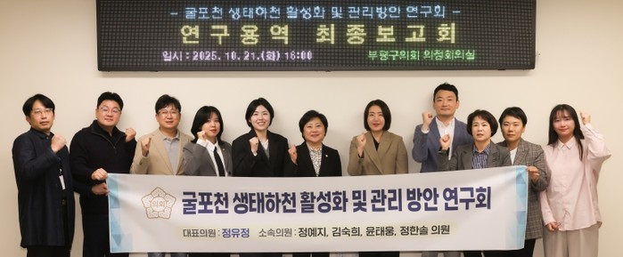 [코리아 이슈저널=홍춘표 기자] 인천 부평구의회 의원연구단체인 ‘굴포천 생태하천 활성화 및 관리 방안 연구회(대표의원: 정유정)’는 21일 부평구의회 2층 의정회의실에서 ‘굴포천 생태하천 활성화 및 관리 방안 연구’를 과업으로 하는 연구용역 최종 보고회를 개최했다.