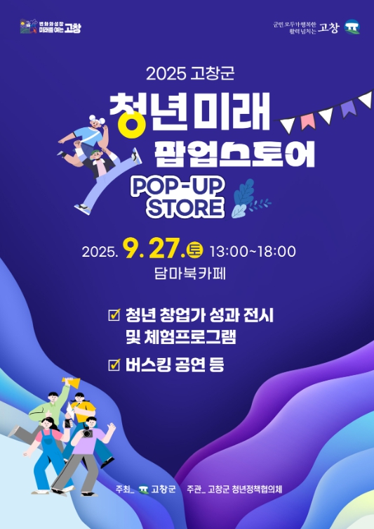 [코리아 이슈저널=김종오 기자] 고창군은 오는 9월27일 오후 1시부터 담마북카페에서 2025 청년의 날 기념행사 ‘청년미래 팝업스토어’를 연다.