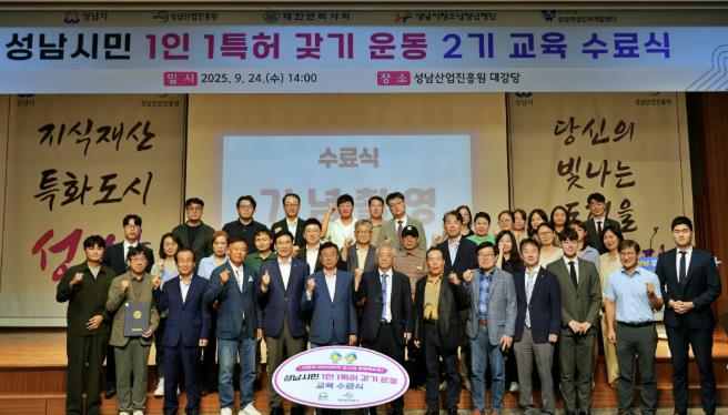 [코리아 이슈저널=홍춘표 기자] 성남산업진흥원은 9월 24일(수) 대강당에서 『성남시민 1인 1특허 갖기 운동』 제2기 교육 수료식을 개최하고, 시민 지식재산 역량 강화의 성과를 공유했다.