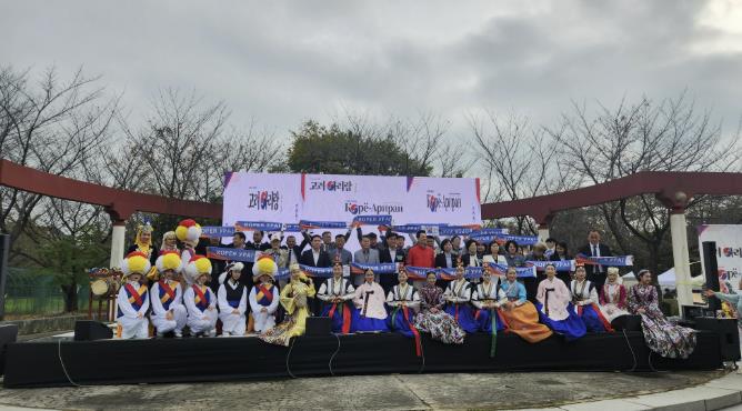 | ▲ 지난 18일 화랑유원지 소공연장에서 열린 ‘광복 80주년 기념, 제9회 고려아리랑 행사’ 참여자들이 함께 기념촬영을 하고 있다. |
