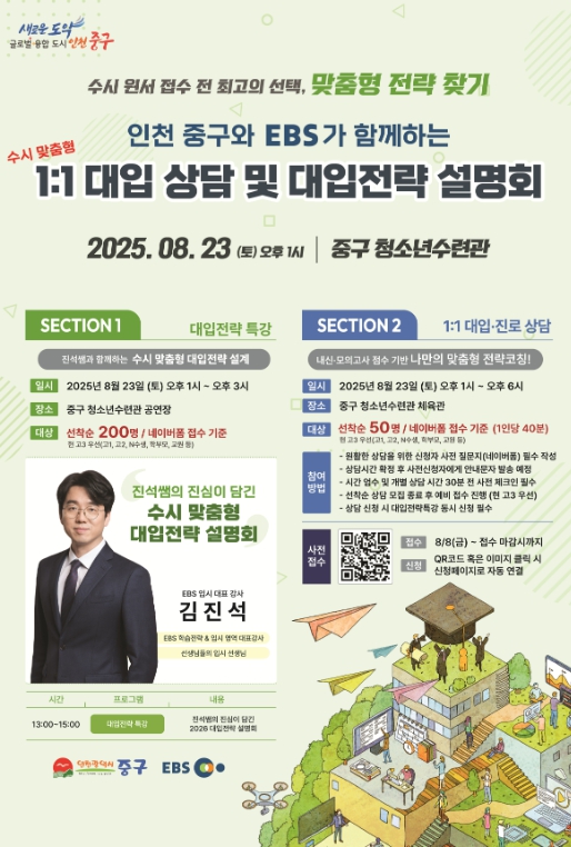 [코리아 이슈저널=홍춘표 기자] 인천시 중구는 2026년도 대학 수시모집을 앞두고 ‘EBS와 함께하는 2025년 입시설명회’를 오는 23일 중구 청소년수련관에서 개최한다.