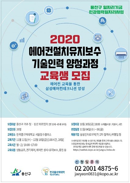 [열린의정뉴스 = 이창희 기자] 서울 용산구(구청장 성장현)가 2020년 구 일자리기금 민관협력 지원사업 일환으로 ‘에어컨 설치·유지보수 기술인력 양성과정’ 교육생을 20명 모집한다.