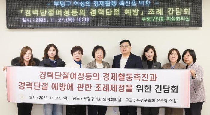 [코리아 이슈저널=홍춘표 기자] 인천 부평구의회는 지난 27일 의회 의정회의실에서 윤구영 의원(국민의힘, 삼산2동, 부개2ㆍ3동)이 대표발의한 '인천광역시부평구 경력단절여성등의 경제활동 촉진과 경력단절 예방에 관한 조례'제정을 위한 간담회를 진행했다.