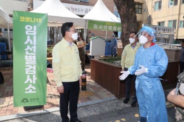 유성훈 금천구청장은 지난 15일에 독산3동 '독산 보건분소' 임시선별검사소를 방문해 운영상황을 점검하고, 근무자들을 격려했다.