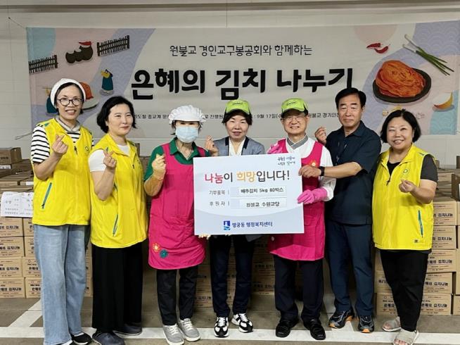 [코리아 이슈저널=홍춘표 기자] 원불교 수원교구가 민족 대명절 한가위를 앞두고 소외된 이웃을 위한 따뜻한 나눔을 실천했다. 수원시 팔달구 행궁동 행정복지센터에 배추김치 5kg 80박스를 후원한 것이다.