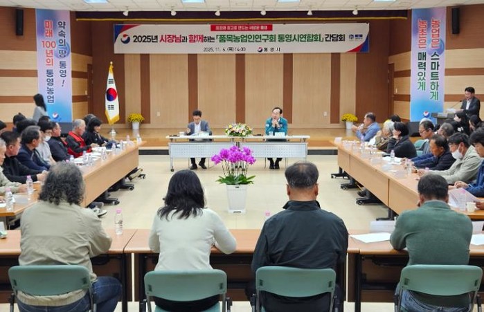 이날 간담회에는 천영기 통영시장을 비롯해 농업기술센터 관계자, 품목농업인연구회 회원 등 100여 명이 참석해 품목별 현안과 농업 발전 방향을 논의했다.