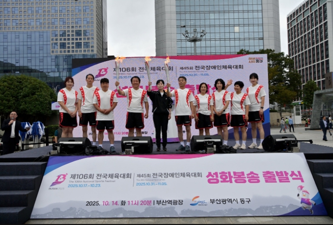 [코리아 이슈저널=김태훈 기자] 부산 동구는 14일 오전 11시 20분, 제106회 전국체육대회 및 제45회 전국장애인체육대회의 성공적인 개최를 기원하고 대회의 시작을 알리는 성화봉송 출발식 행사를 부산역 광장에서 개최했다.