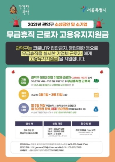 [열린의정뉴스 = 이창희 기자] 관악구(구청장 박준희)가 코로나19로 인한 집합 금지, 영업 제한 등으로 어려움을 겪고 있는 기업체 근로자의 실업 예방과 생계유지를 위해 무급 휴직 근로자를 대상으로 '고용유지지원금'을 지원한다고 밝혔다.