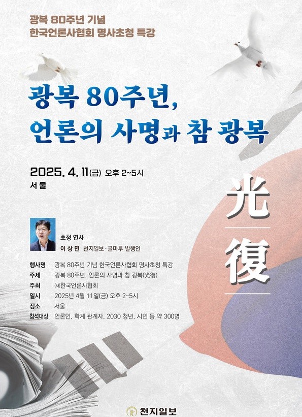 ㈔한국언론사협회가 오는 4월 11일 오후 2시 서울에서 ‘광복 80주년, 언론의 사명과 참 광복(光復)’을 주제로 명사초청 특강을 개최한다. 이번 행사는 한국언론사협회가 주최하고, 천지일보·글마루가 주관하여 진행된다.
