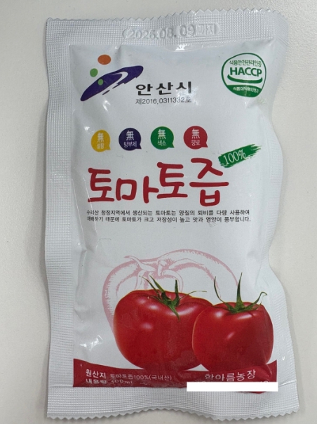 [코리아 이슈저널=김윤영 기자] 식품의약품안전처는 식품제조·가공업체인 ‘한아름농장(경기도 안산시 소재)’이 제조·판매한 ‘토마토즙(식품유형: 과·채주스)’에서 납이 기준치보다 초과 검출되어 해당 제품을 판매 중단하고 회수 조치한다고 밝혔다.
