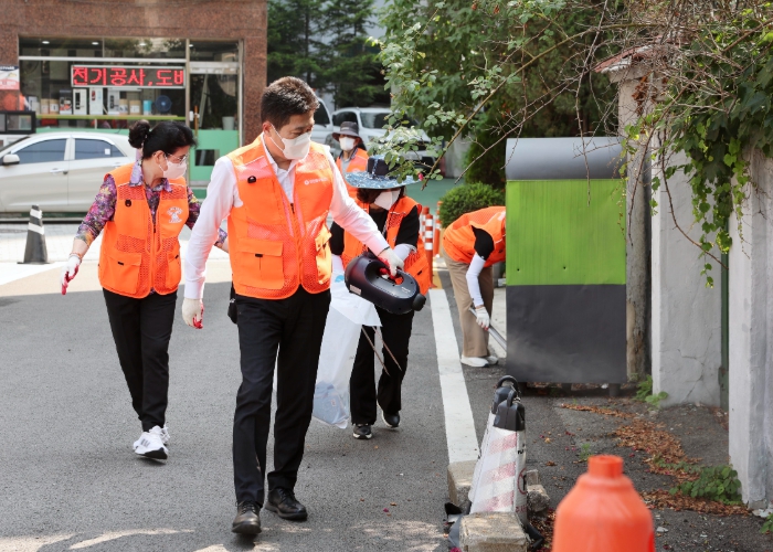 이날 김정헌 구청장과 주민자율방역단, 보건소 방역기동반은 주택가 골목, 하수구 등 동네 취약지역을 중심으로 구석구석 연무 방역을 진행했다.