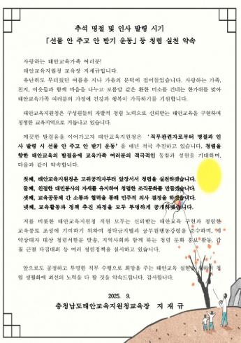[코리아 이슈저널=홍종수 기자] 충청남도태안교육지원청은 추석 연휴 시기를 맞아 청렴한 공직문화를 확산하기 위해 ‘선물 안 주고 안 받기 운동’을 강조하는 청렴 서한문을 홈페이지에 게시했다.