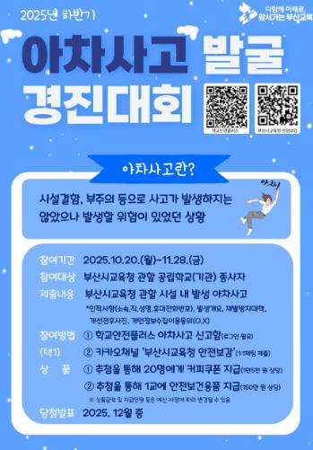[코리아 이슈저널=김태훈 기자] 부산광역시교육청은 지난 20일부터 다음달 28일까지 관내 학교(기관) 근로자를 대상으로 ‘하반기 아차사고 발굴 경진대회’를 개최한다고 29일 밝혔다.