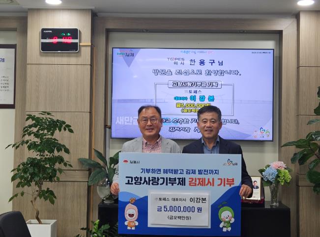 [코리아 이슈저널=김종오 기자] 김제시는 ㈜토페스 이강본 대표가 3일 고향사랑기부금 500만 원을 기탁했다고 밝혔다.