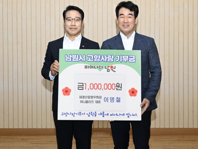 이 향우회장은 “한 개인의 기부가 지역발전에 보탬이 되는 것을 보고 느끼는 건 엄청난 경험”이라며, “앞으로도 향우들이 주축이 되어 남원의 성장과 발전을 적극 응원하겠다”고 소감을 전했다.