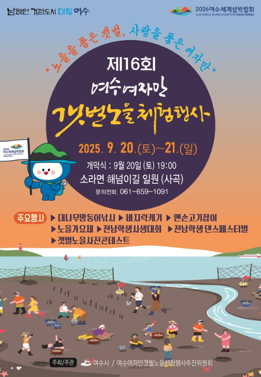 [코리아 이슈저널=김종오 기자] 여수시는 오는 9월 20일부터 21일까지 이틀간 소라면 해넘이길 일원에서 ‘제16회 여수여자만갯벌노을체험행사’를 개최한다.