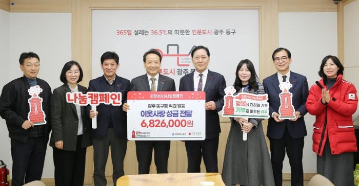 [코리아 이슈저널=김종오 기자] 광주 동구는 지난 6일 구청 접견실에서 ‘희망 2026 나눔캠페인 직원 성금 전달식’을 갖고, 직원들의 자발적인 참여로 모금한 성금을 광주사회복지공동모금회에 전달했다고 밝혔다.