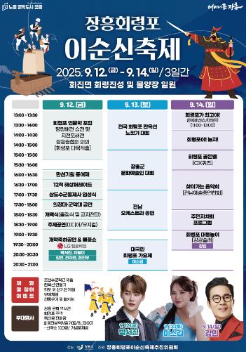 [코리아 이슈저널=김종오 기자] 장흥군은 9월 12일부터 14일까지 3일간, 장흥군 회진면 회령진성 및 회진항 물양장 일원에서 2025 장흥 회령포 이순신 축제를 개최한다고 밝혔다.