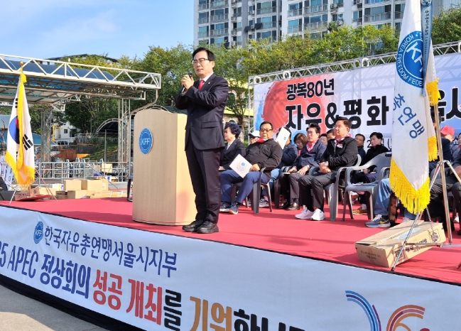 [코리아 이슈저널=최성일 기자] 서울특별시의회 통일안보포럼 대표의원인 김형재 의원(국민의힘·강남2)은 25일 마포구 망원유수지 체육공원 운동장에서 열린 ‘광복 80년, 자유·평화 서울시민 체육대회’에 참석해 축사를 전했다.