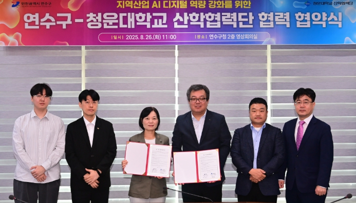 [코리아 이슈저널=홍춘표 기자] 연수구는 지난 26일 영상회의실에서 청운대학교 산학협력단과 지역 내 기업과 소상공인을 위한 전문 기술 지원, 기업 지원 협력체계 강화를 위한 업무협약을 체결했다.