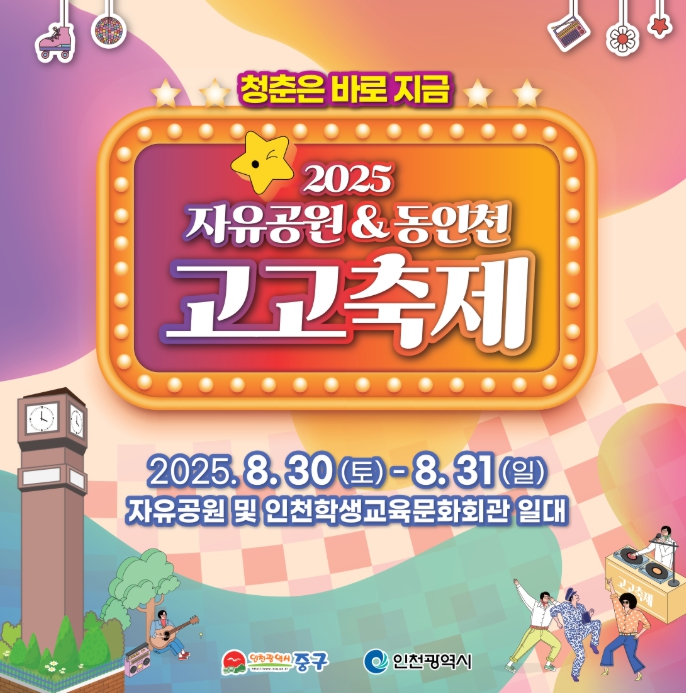 [코리아 이슈저널=홍춘표 기자] 인천시 중구는 8월 30일 ~ 31일 열정과 낭만의 계절 여름을 맞이해 ‘청춘’을 만끽할 수 있는 2025 자유공원·동인천 고고축제 인천 중구 자유공원과 동인천 학생교육문화회관 일원에서 열린다고 밝혔다.