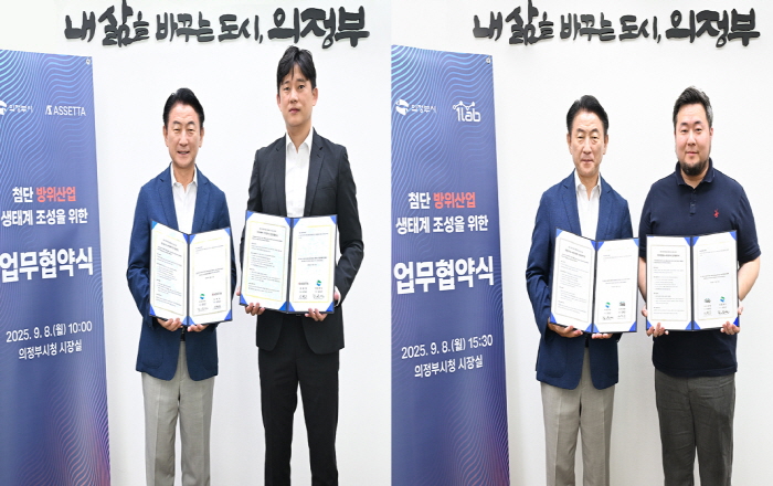 [코리아 이슈저널=홍춘표 기자] 의정부시는 9월 8일 드론 산업의 선도기업 ㈜아쎄따, 아이원랩㈜과 ‘첨단 방위산업 생태계 조성’을 위한 업무협약을 체결했다.