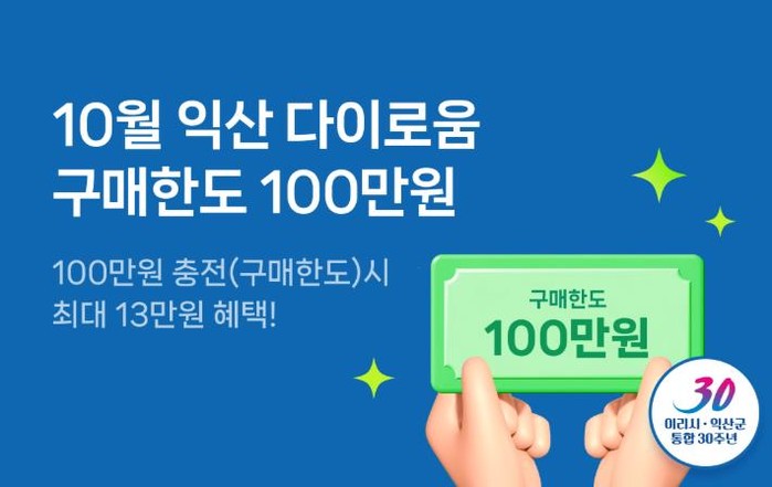 [코리아 이슈저널=김종오 기자] 익산시가 이리시·익산군 통합 30주년과 시민의 날(10월 3일)을 기념해, 10월 한 달간 지역사랑상품권 '익산 다이로움'의 개인별 구매한도를 기존 60만 원에서 100만 원으로 확대한다고 30일 밝혔다.