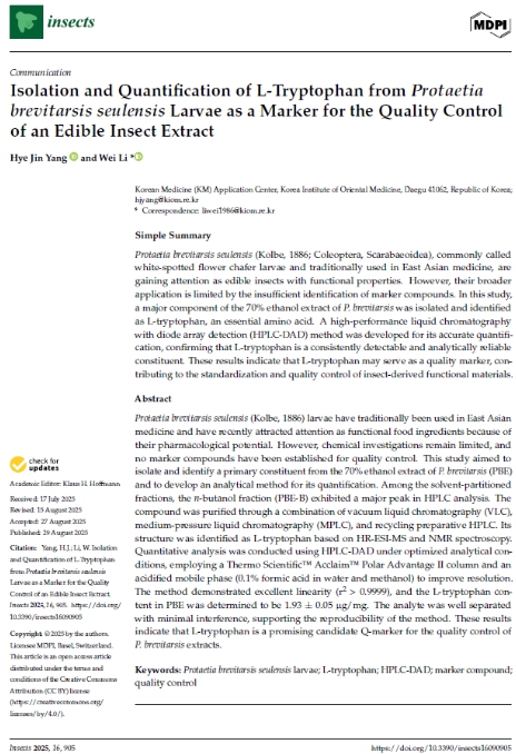 농촌진흥청은 이번 연구로 꽃벵이 추출물의 뼈 건강 개선 지표성분이 L-트립토판임을 밝히고 국제학술지 Insects(IF 2.9)에 논문으로 게재했다. 이로써 꽃벵이를 활용한 기능성 소재 표준화와 품질관리 체계 확립의 과학적 근거를 마련했다.