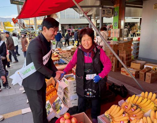 [코리아 이슈저널=홍춘표 기자] 이현창 전라남도의원(더불어민주당, 구례)은 지난 11월 13일 구례 5일시장을 방문해 '전통시장 장보기 및 기부 캠페인'에 참여했다.