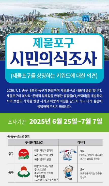 설문조사의 내용으로는 ▲제물포구의 이미지를 나타내는 단어 ▲제물포구 상징 마크(CI)에 담겼으면 하는 의미 ▲제물포구를 상징하는 캐릭터 소재가 포함돼 있다.