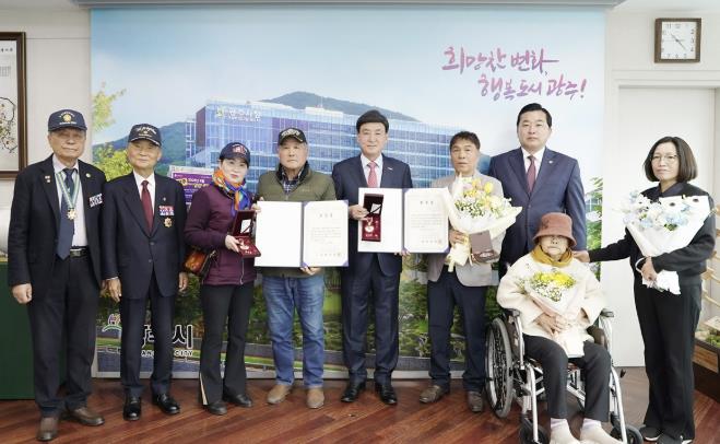 [코리아 이슈저널=홍춘표 기자] 광주시는 지난 9일 6·25전쟁에 참전해 공을 세운 고 최광복 하사와 고 강창호 상사의 유가족에게 화랑무공훈장과 증서를 전달했다.