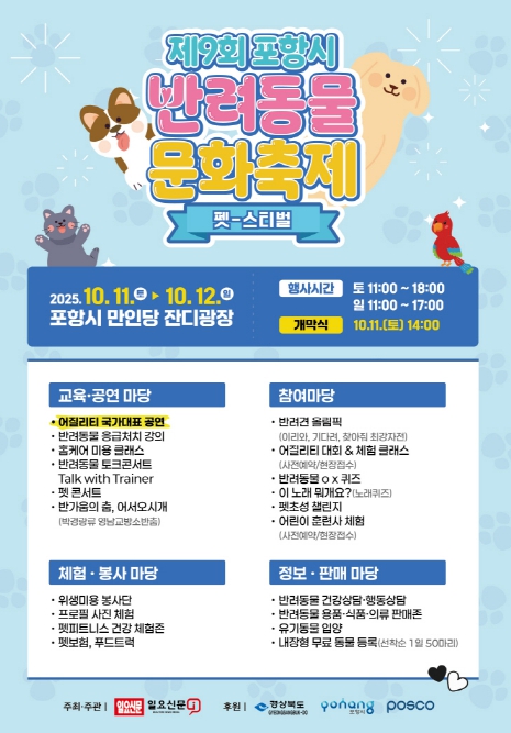 [코리아 이슈저널=김태훈 기자] 포항시는 오는 10월 11일부터 12일까지 만인당 잔디광장에서 ‘제9회 포항시 반려동물 문화축제’를 개최한다.