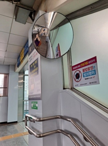 계단 및 에스컬레이터 옆 벽면에 설치된 안심 거울로 뒷사람의 행동을 확인할 수 있어 불법 촬영 사실을 인식할 수 있으며 불법 촬영에 대한 심리 억제 효과도 기대할 수 있다.