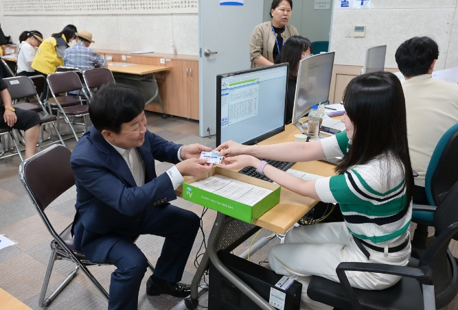 [코리아 이슈저널=김종오 기자] 정기명 여수시장이 민생회복 소비쿠폰 1차 접수 이튿날인 지난 22일 쌍봉동주민센터를 방문해 발급 현황을 점검하고 직원들을 격려했다.