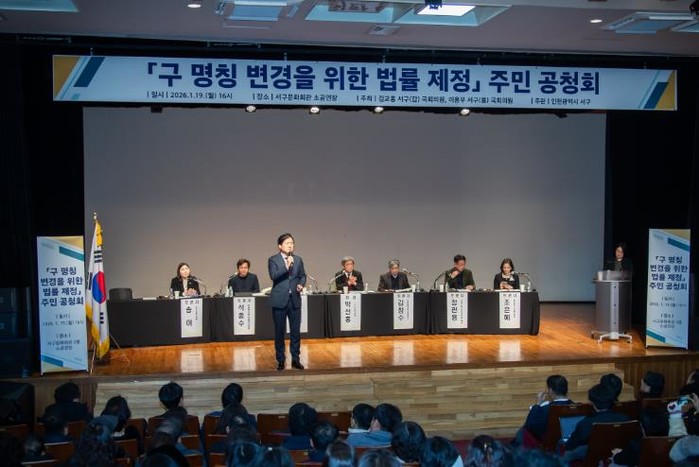 [코리아 이슈저널=홍춘표 기자] 인천 서구는 지난 19일 서구문화회관 소공연장에서 지역주민 약 200여 명이 참석한 가운데 ‘구 명칭 변경을 위한 법률 제정 주민 공청회’를 개최하고 주민 의견을 수렴했다.