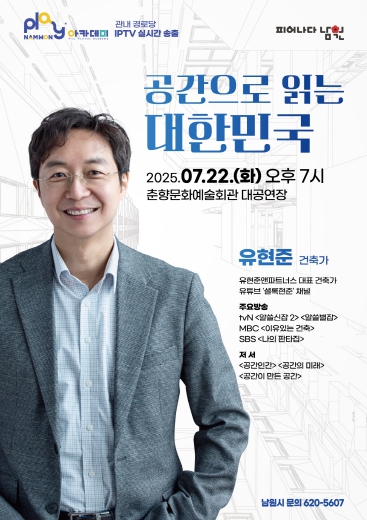 [코리아 이슈저널=김윤영 기자] 남원시는 22일 오후 7시, 춘향문화예술회관 대공연장에서 대한민국을 대표하는 건축가 유현준 교수를 초청하여 “공간으로 읽는 대한민국”이라는 주제로 강연을 개최한다.