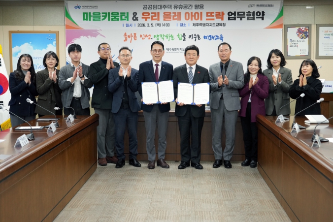 [코리아 이슈저널=김태훈 기자] 제주특별자치도교육청은 제주특별자치도개발공사와 5일 도교육청 상황실에서 공공임대주택 유휴공간을 활용한 ‘우리 올레 아이 뜨락’ 사업과 도교육청 ‘2026 마을키움터 운영’ 사업의 상호 협력을 위한 업무협약을 체결했다.