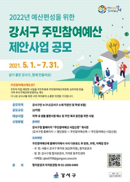 [열린의정뉴스 = 김진성 기자] 서울 강서구(구청장 노현송)는 내년도 사업 예산을 주민들이 직접 제안하는 '2022 주민참여예산 제안 사업 공모'를 진행한다고 밝혔다.