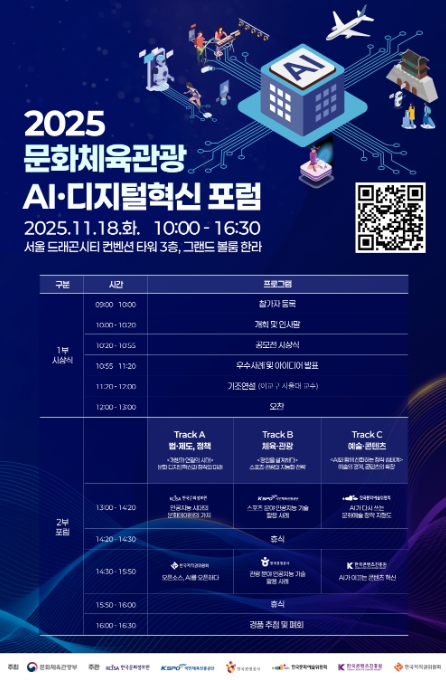 [코리아 이슈저널=최용달 기자] 문화체육관광부는 문화·체육·관광 분야 전문기관들과 공동으로 11월 18일, 서울드래곤시티(서울 용산구)에서 ‘2025 문화체육관광 인공지능(AI)·디지털혁신 포럼’을 개최한다.