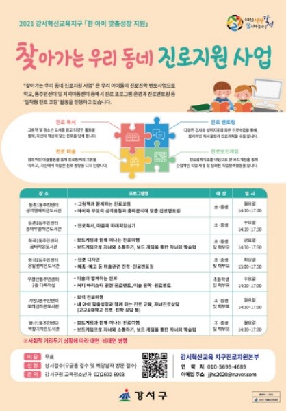 [열린의정뉴스 = 김진성 기자] 서울 강서구(구청장 노현송)는 학교, 동주민센터, 지역아동센터에서 아이들의 진로 진학 멘토가 돼 주는 '찾아가는 우리 동네 진로 지원 사업'을 추진한다.