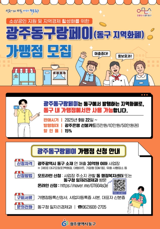 [코리아 이슈저널=김종오 기자] 광주 동구는 지역 내 소비 촉진과 소상공인 지원을 위해 마련한 지역화폐 ‘광주동구랑페이’를 오는 9월 22일부터 발행하는 데 앞서 사용처인 가맹점을 모집한다고 밝혔다.