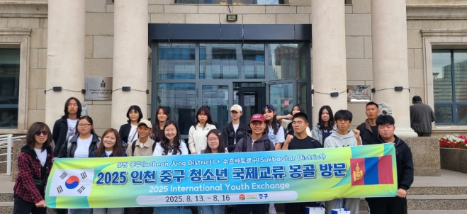 인천시 중구(구청장 김정헌)는 지난 13일부터 16일까지 나흘간 청소년 외교관 대표 10명이 우호교류도시인 몽골 울란바토르시 수흐바토르구를 방문해 ‘2025년도 청소년 국제교류 활동’을 성황리에 진행했다고 밝혔다.